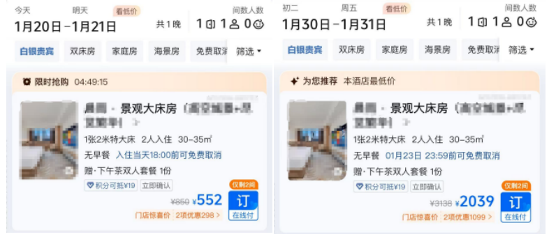 汕头某旅舍的“景不雅大床房”,1月20日的入住价钱为552元,1月30日(大年头二)的入住价钱为2039元。