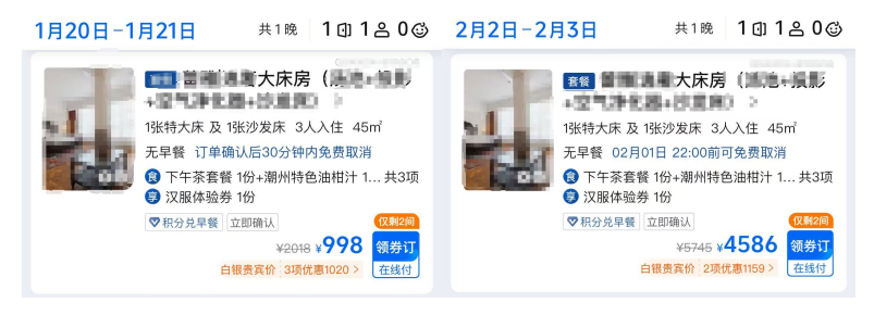 潮州某民宿的“XX大床房”,1月20日的入住价钱为998元,2月2日(大年头五)的入住价钱为4586元。