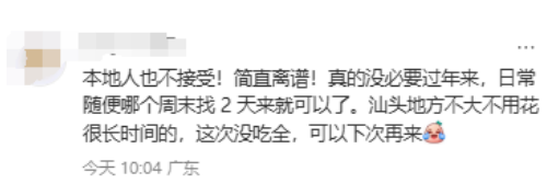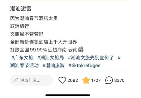 气性大的北京网友,更是径直祭出了经典【避雷贴】:“因为潮汕春节旅舍太贵,取消旅行,文旅局不论吗?一都低价连锁旅舍上千,大长见识,击败天下99.99%远超海南、云南。”