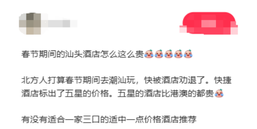 有朔方网友吐槽:“春节技术,汕头的快捷旅舍标出了五星的价钱。”