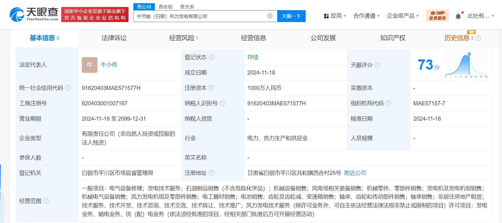 每经AI快讯,天眼查App知道,近日,中节能(白银)风力发电有限公司缔造,法定代表东谈主为牛小伟,注册本钱1000万元东谈主民币,运筹帷幄限度含电气开垦修理、发电时刻作事、石油成品销售、机械开垦销售、风电场关系装备销售、风力发电机组及零部件销售等。鼓动信息知道,该公司由节能风电(601016)全资握股。