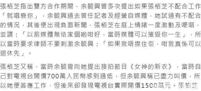 2014年余毓兴本东谈主更涉嫌伪造公司公章。 冒用牙东谈主身份为张柏芝签约综艺《女神的新衣》。 张柏芝在庭上称那时余毓兴告诉她电视台开价700万东谈主民币。