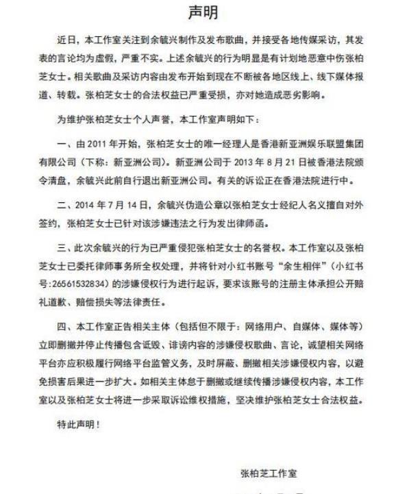 看成回复,张柏芝责任室发布声明称。 余毓兴的歌曲及关系言论均为豪恣,是“有筹划地架词诬控”。