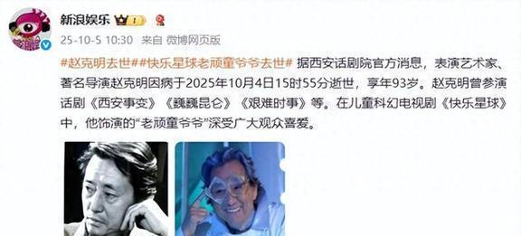 10月5日,有多个媒体音书说,着名演员赵克明因病亏本,享年93岁。